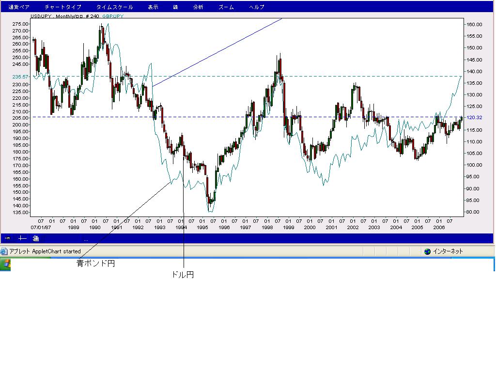さてしかしながらどれほど栄華を誇る 通貨高もいつか終りがくるもんだがどこなのか? ここで紹介したいのが92年の9月のポンド円 推移だ。 247-190までの57円の暴落である。 正確にはこれはソロス氏のしかけとEMS そしてユーロの通貨統合に対応できなかった 英中央銀行の戦いの結果だが そのレベルが近づいているのを認識したい。 目処は246円 2005年の例からしても欧州暴落は ドル円2005の12月の3倍のオーバシュートを 予想しているが。これで儲けるのは至難の技だろう。 正直1-3月での崩壊は50%と見ている。 時間をかけて騰がったものはある程度時間をかけて 消化する。 さてユロドルだが 指標で弾き返されたものの来週にはと読んでいる。 こちらもかなり弱気なチャート まだ春には遠い。 現在のポジ ユロドル1.3120 25S カナダ円 101.80 20L 豪円 89.05 2L 香港ドル円 15.05 5L |
