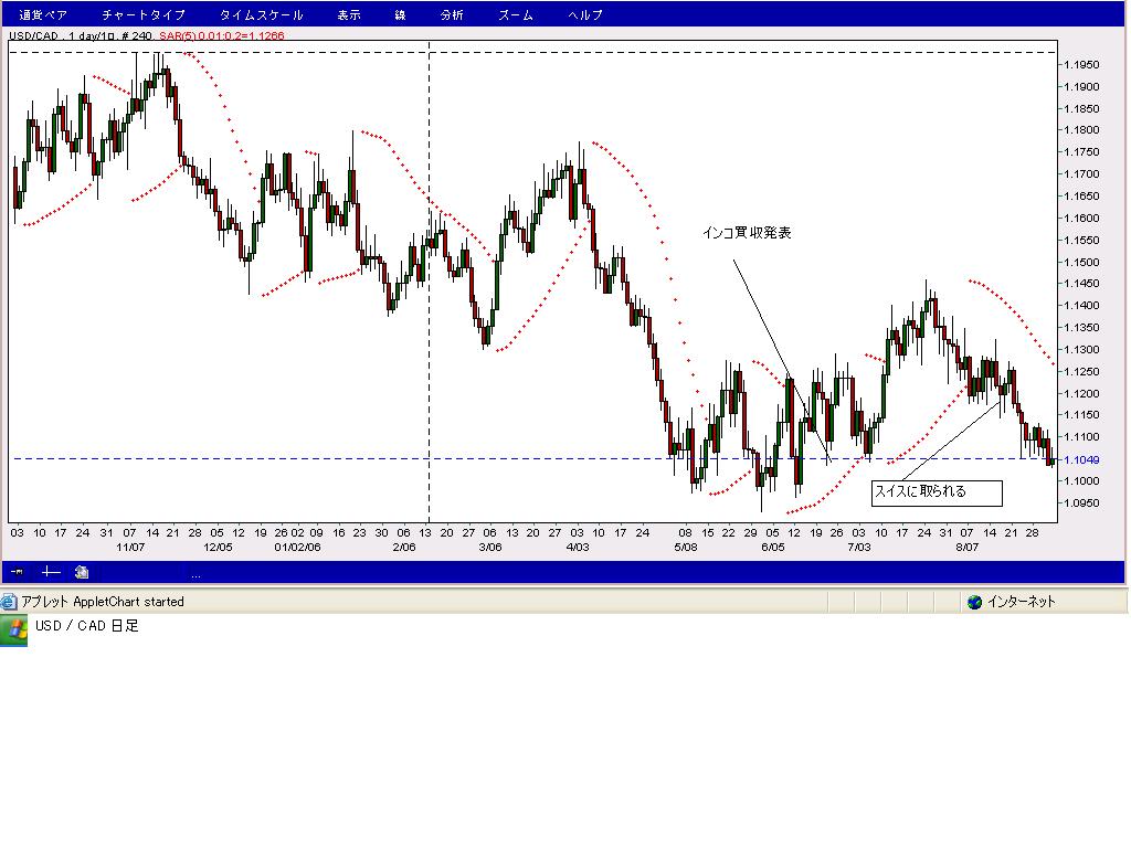 さて以前より戦争が始まる価格まで折込した カナダ高がいっこうに戻らず不思議でしたが 2重底をつけたかと私は冷静に見守ってますが 1 6月26日からの米国の銅最大手フェルプス・ドッジ→インコ 銅の買収がうまくいかなかった400億ドル 2 最終的にはブラジルとの競争で9月中に株主投票があるらしい 1ですが正確にはインコ(カナダ)が同国の鉱山を買収していて それも米フェルプスドッジが面倒見るハズでしたのが そのファルコンブリッジへの買収がどうも スイスのエクストラータがそちらの買収に成功したということ です。 よって見通しとして私の悲願である 400億ドルの行方は時間がかかる ようだやや旗色は悪いぞ(2月ほど)との認識ですが... ソフトバンク→ボーダフォンの買収はその半分の 200億ドルです。 また1円円高になったユニシスの売収は40億ドルだったはず (記事消えてます...)というわけで 1 9月25日からの復活をイメージした仕込み 2 9月25日からの崩壊をイメージした損きり か思案どころですがやはりお得意の原油推移が軟調へと 今月は変化すると読んでますので1にかけるとします。 |