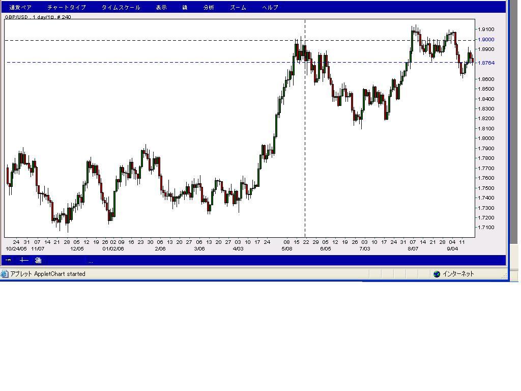 かなりOP攻防もありおもしろい飼い葉です。 先日話した 1 NZDUSD 0.6300台 ロング 2 GBPUSD 1.900台 ショート 3 NZDJPY 73.0台 ロング(小額 2.3は既に割れてますのと注意で却下 となると 1のNZDUSDとなります。 もちろん豪円もおいしいのですが ここは様子見でいいと思われます。まだ今月は いつか円高が来ると見てます となるとクロス円以外で伸びが期待できそうなのは ユロドルかこいつになります。ドルカナダもですが 長期塩づけも視野に入れますと(おいおい) スワップと2つでおいしいペアになりますので ただNZは注意通貨ですので0.6260でのSTOPは入れた ほうがいいです。 というわけで続いて本日の損切!利食い ユーロドル 1.2900 10S ← 5枚減少 1.2670 で利食い 5万X230PIP ドルカナダ 1.1155 5L 1.1200 3L ポンドドル 1.8900 3S 1.8650 3S利食い 3SX 250pip AUDUSD 0.7645 5L ←失敗だ! 0.7550 ストップ5X95PIP 計円転後16万円ほど.. 今月目標は月10%の90万まで 遠い.......。 かものはし見通しの甘さを反省! 本日新規 NZDUSD 0.6377 2L ← 0.6320まで買い下がり STOP0.6260 |