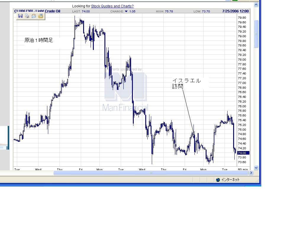 さて今後の短期的動きを想定してみます。 先週末米ライス国務長官がイスラエルを訪問 その後米が調停派兵が明らかになり 日経 今後は下落トレンドと普通は考えますが お恥ずかしながらの予想は私は現在押しと読みます。 70ドルで跳ね返されそのご再度76ドル台に到達する イメージです。 さてそのあたりの事情でかものはしAUDUSDは 強気に見ています。利上げもしくは据え置きですと 0.77突入も視野にいれております。 日本でも製紙系及びポリエステルの値上げが本格化しており トレンド的に原油急落はかなり先であると見てます。 ドルカナダ 1.1200 3L AUDUSD 0.7295 3L 豪円 85.55 1L→88.20 決済済み ユーロUSD 1.2490 2L 売っててよかったユーロドル まあ1.24割れるようですとまた買いますが 本日新規 ユーロポンド0.6831 8L ERUAUDもいいかんじですが...豪売りはしない方針です ので。 |